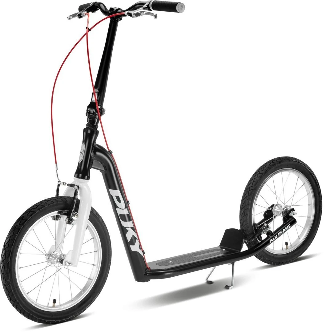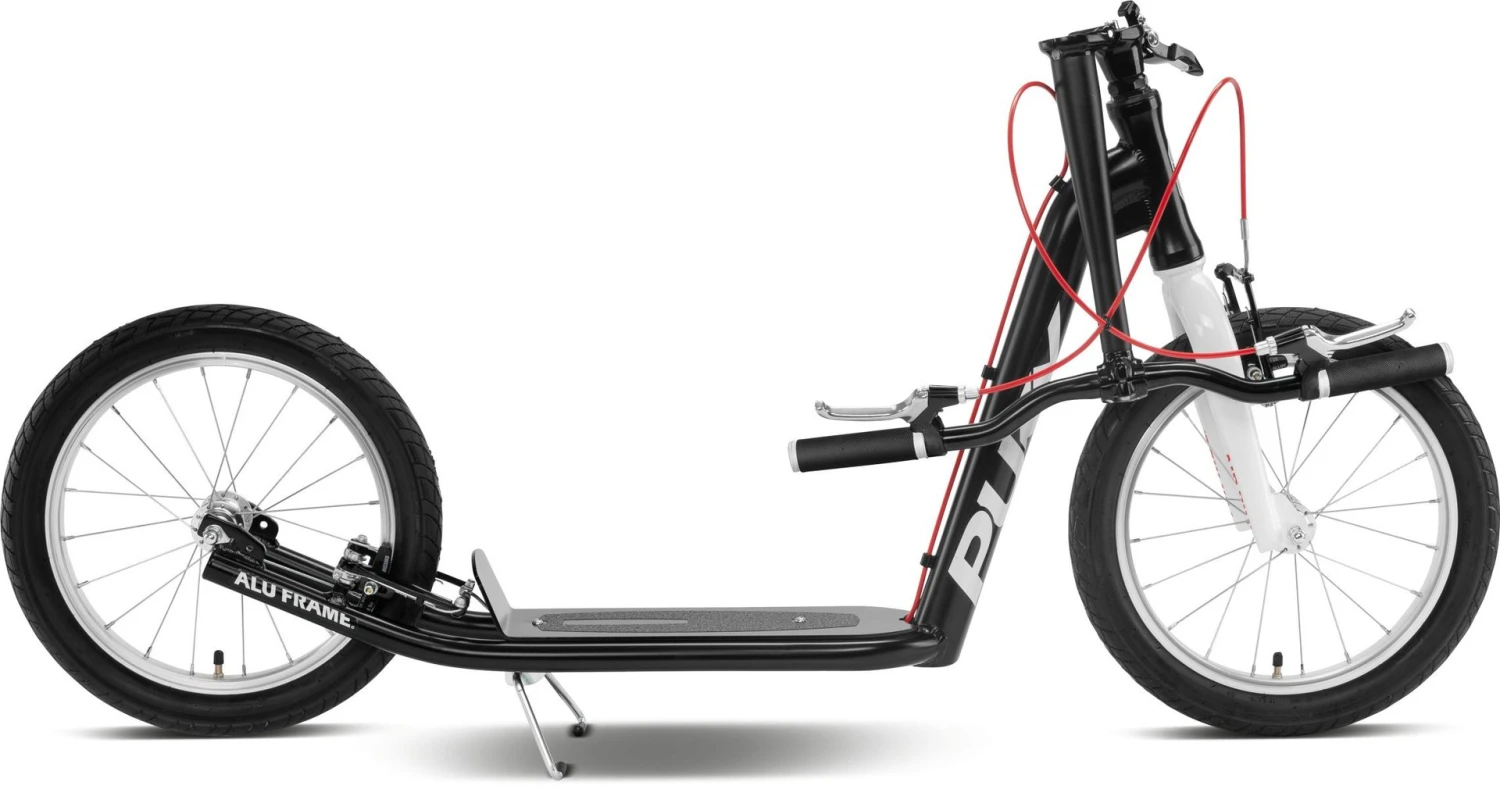 Wer flott und stylisch unterwegs sein möchte, kommt an PUKY JOKER nicht vorbei. Ob für einen kurzen Trip durch die Wohnsiedlung oder der Pendelweg zur Arbeit. Mit seinen 16″ Alu-Laufrädern liegt der PUKY JOKER gut auf der Straße und überwindet kleine Hindernisse spielend leicht. Für langanhaltende Laufruhe sorgen zudem die kugelgelagerten Speichenräder und die Lenkung. Für massig Grip hat Puky dem Scooter Dual-Density-Griffe sowie ein rutschfestes Trittbrett verpasst. Die griffigen V-Brakes vorne und hinten bringen den PUKY JOKER schnell zum stehen. Wie alle Puky-Modelle hat der Alu-Scooter eine stoßfeste Pulverbeschichtung vorzuweisen. Der PUKY JOKER wiegt dank leichtem Alurahmen nur 7,7 kg und kann durch den Klapp-Vorbau verkleinert werden. Damit Jung und Alt Spaß am cleveren Scooter haben, lässt sich der Lenker des PUKY JOKER in der Höhe verstellen.