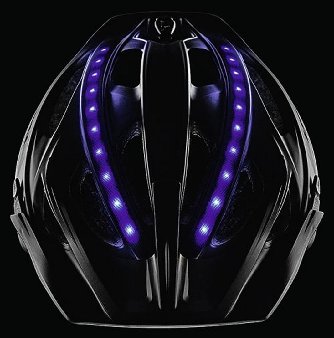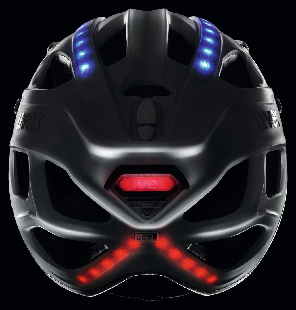 In ausgeschaltetem Zustand erscheint der UVEX City Light als schlichter, sportlicher City-Radhelm. Erst beim Druck auf den Power-Button zeigt er sein wahres Gesicht: Insgesamt vier unter der Außenschale liegende leuchtende LED-Bänder mit 32 LEDs zwei blaue vorne, zwei rote hinten machen den Radfahrer in der Dämmerung oder Dunkelheit gut sichtbar. Der Radfahrer kann dabei ganz einfach zwischen stehendem, blinkendem und fadendem Licht per Knopfdruck wechseln. Je nach Modus hält der integrierte Akku zwischen 6 und 12 Stunden. Innerhalb zwei Stunden kann er über das mitgelieferte USB-Kabel aufgeladen werden. Eine zusätzliche LED zeigt den Ladestatus: – Grün: 60% verbleibende Leistung – Grün-Rot: zwischen 30 und 60% verbleibende Leistung – Rot: verbleibende Leistung unter 30%