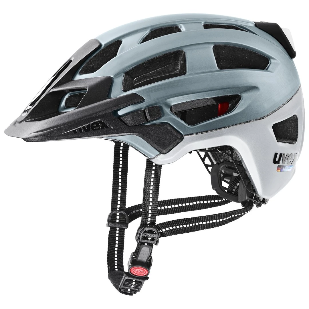 Ursprünglich wurde der uvex Finale für die Stages des Enduro World Series in Finale Ligure entwickelt. Seine Formensprache mit tief heruntergezogenen Seitenteilen und einem verstellbaren Visier übersetzt uvex jetzt in die Stadt und stattet den Mountainbike-Helm mit einer integrierten LED-Beleuchtung unter der Schale aus. Insgesamt vier unter der Außenschale liegende leuchtende LED-Bänder – zwei blaue vorne, zwei rote hinten – machen Dich mit insgesamt 32 LEDs in der Dämmerung oder Dunkelheit gut sichtbar. Dabei kann auf Knopfdruck zwischen stehendem, blinkendem und ausblendendem Licht gewechselt werden. Versorgt werden die Lämpchen durch den diskret verbauten und per USB aufladbaren Akku. Je nach Modus hält dieser zwischen 6 und 12 Stunden und kann über das mitgelieferte USB-Kabel innerhalb von zwei Stunden aufgeladen werden.