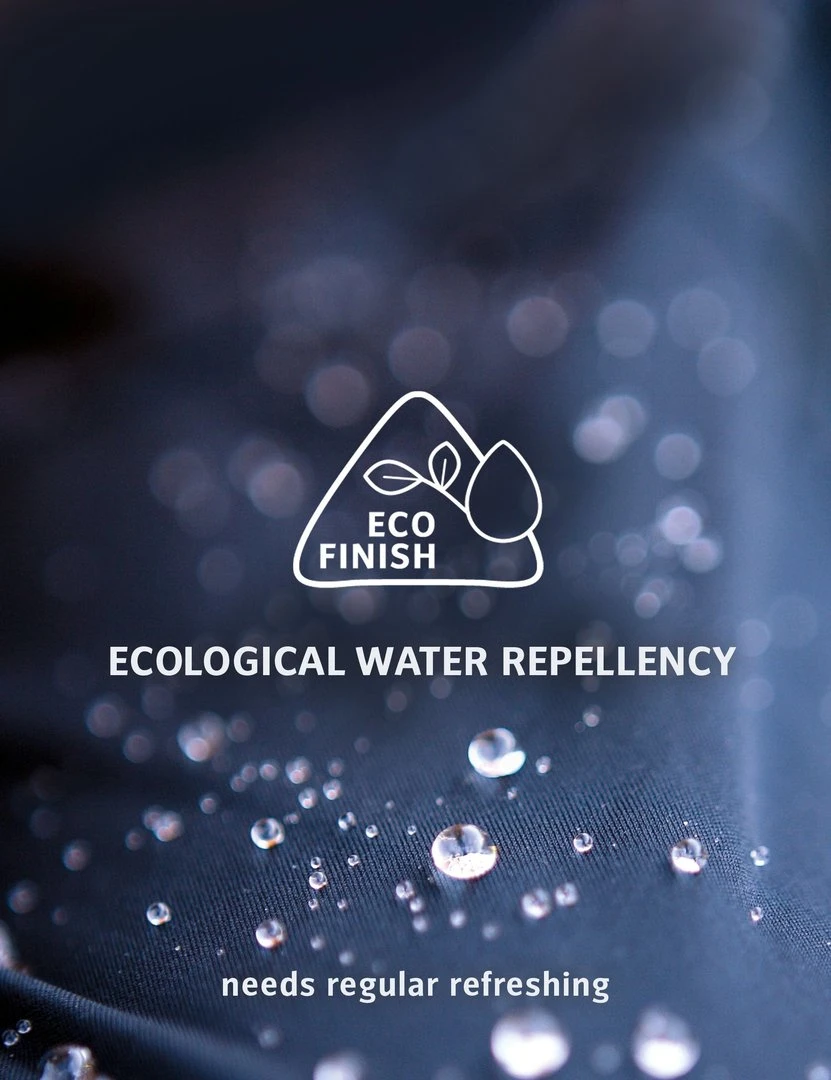 Diese wasser- und schmutzabweisende Ausrüstung wird auf den Oberstoff deines Produktes aufgebracht. Dadurch perlen Regentropfen ab – und das ohne den Einsatz von umweltschädlichen Fluorcarbonen (PFC). Das schützt dich vor Regen und hält die Natur sauber. Für eine dauerhafte Wasser- und Schmutzabweisung ist eine regelmässige Nachbehandlung nötig.